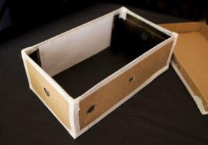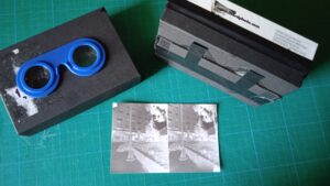 En un aula explicaremos el proceso básico de la fotografía estereoscópica y los elementos de la cámara que vamos a construir con la caja de cartón. Pintaremos de negro el interior, abriremos dos estenopos con un trozo de lámina de aluminio y colocaremos las guías para el papel fotográfico y las marcas de encuadre. Cargaremos la hoja de papel emulsionado y saldremos al exterior para exponerlo. Volveremos al aula para revelar cada hoja sumergiéndola en el revelador y en el fijador. Después de lavarla se escaneará con el móvil, se invertirá con una app y se visionarán las fotos a través de unas gafas estereoscópicas.